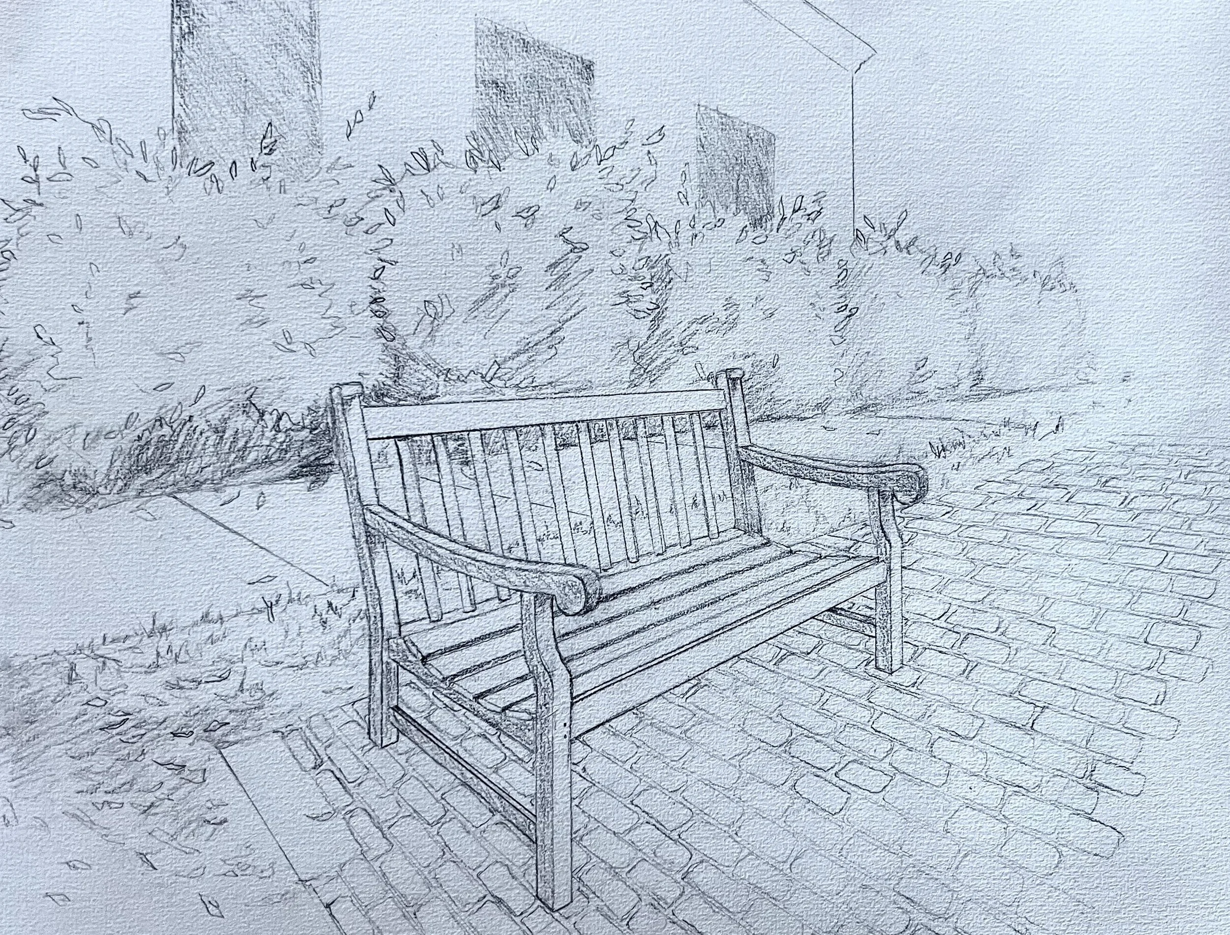 A detailed pencil study capturing a quiet outdoor scene. The composition emphasizes form, texture, and light through careful linework and shading, highlighting the balance between structure and natural elements.