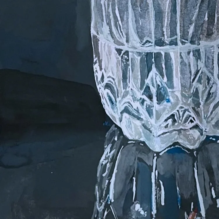 A study of light and color captured through the refraction of a glass resting on a tabletop. Varying hues of blue shift across the surface, blending softly in translucent watercolor layers. The composition highlights the delicate interplay between transparency, reflection, and shadow. -
